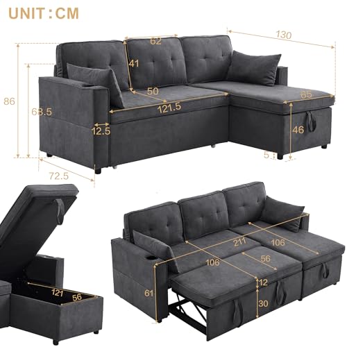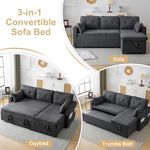 3 In 1 Convertible Sofa Bed Sleeper with Storage, 3 Seater L Shaped Sleeper Sofa Couches with Cup Holders & Pillows & Pockets, Pull Out Sectional Sofa Daybed for Living Room/Bedroom/Office, Grey