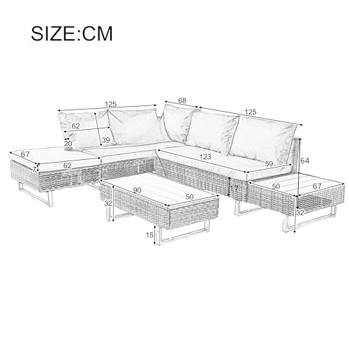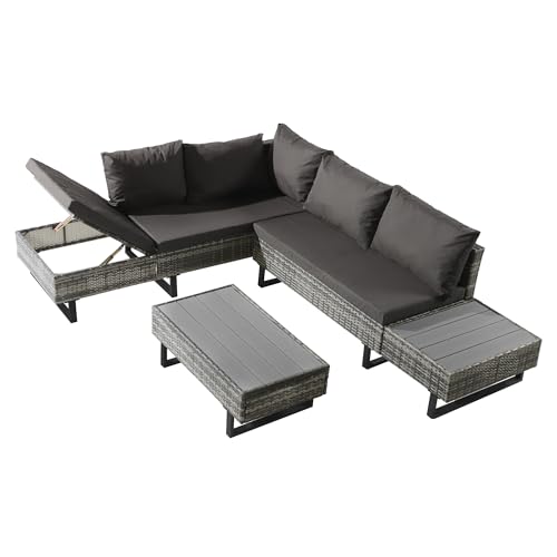 5 Seater Adjustable Reclining Garden Furniture Sets, L-Shaped Corner Sofa with Coffee Table Side Table and Cushions, All Weather Outdoor Conservatory Patio Furniture Rattan Sectional Sofa Set, Grey