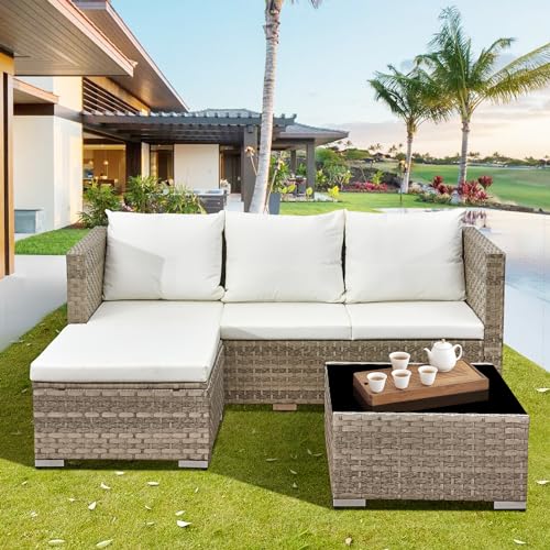 Aweather 3 Pcs Rattan Garden Furniture Sets Outdoor Corner Sofa, All-Weather Handwoven PE Sofa Set, Small Patio Conversation Set with Washable Cushions and Coffee Table, Four Seats