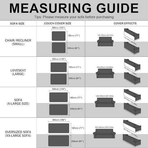 - How to Choose: Please measure before purchasing. We recommend 180x300cm for 2-3 seater; 180x340cm for 3 seater; 180x380cm for 4 seater. Tip: L-shaped U-shaped or irregular sofa is recommended to buy 2-3 pieces of combination