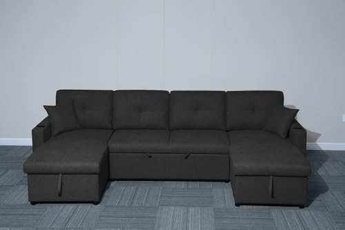 - The sofa is upholstered in bonded leather, offering comfort and functionality.An U-shaped 4-seater pull-out sofa bed with storage.