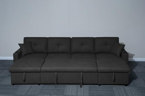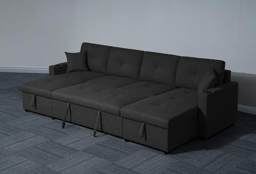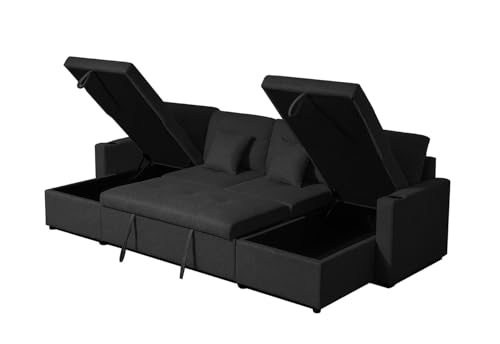 Bonded Leather Sofa Bed – U Shaped 4 Seater Fabric Sofas For Living Room Furniture – Pull Out Suite & Convertable Settee With Storage – (Black Fabric, Right Hand Side)