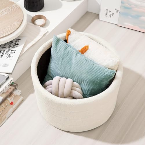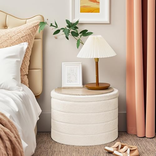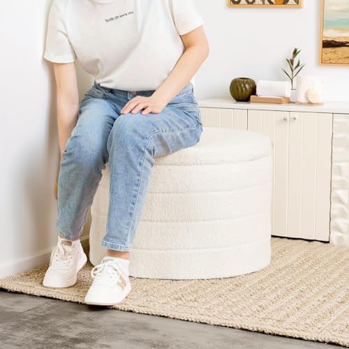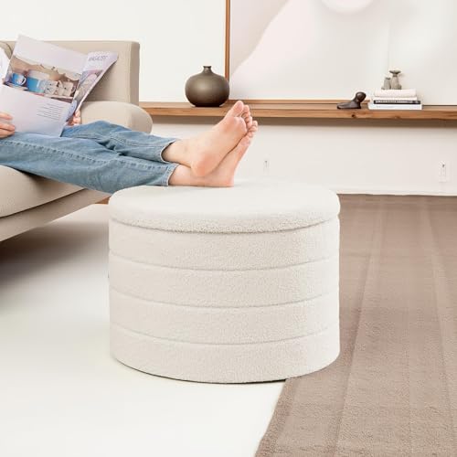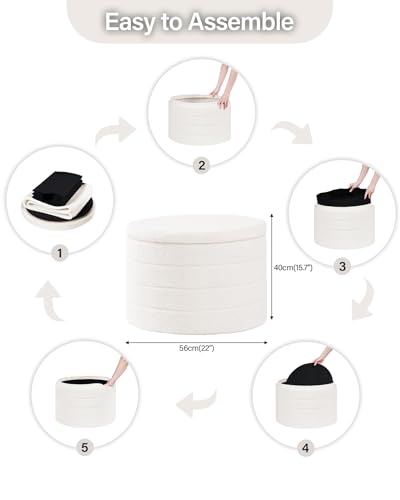 Bonlife Large Round Ottoman with Storage,Folding Boucle Stool,Ottoman Coffee Table,Chest Toy Box,Footstool for Living Room,Bedroom,White,56x56x40cm