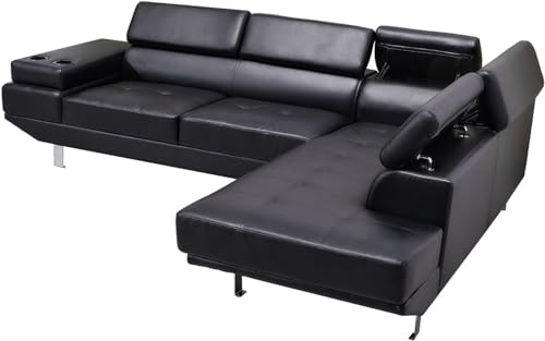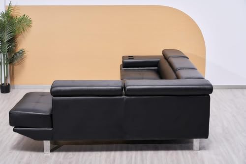 Classic Bonded Leather Corner Sofa Left & Right Hand Side With Adjustable Headrests with Cup Holder (Black, Right Hand Side)