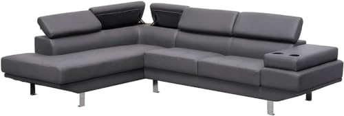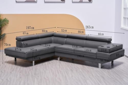 Classic Left & Right Hand Side Bonded Leather Corner Sofa With Adjustable Headrests with Cup Holder (Grey, Left Hand Side)