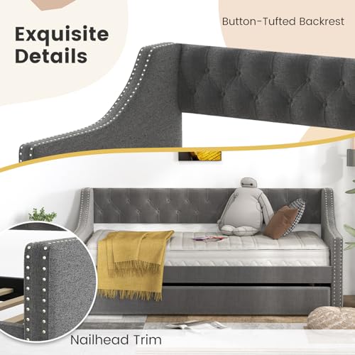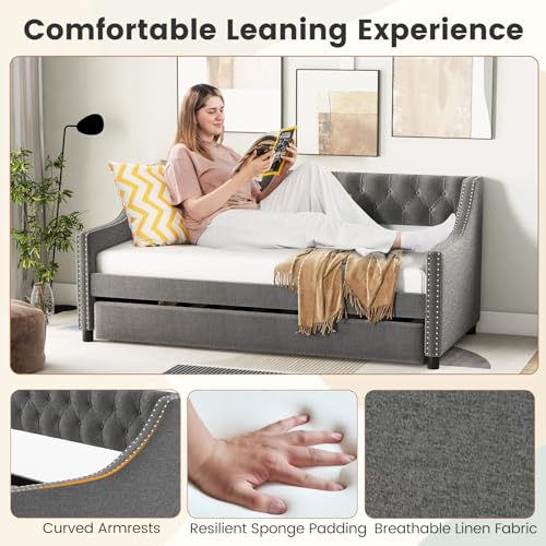 COSTWAY Linen Upholstered Daybed with Trundle, Single Sofa Bed Frame with Button-Tufted Backrest and Wooden Slats Support, 2-in-1 Platform Day Bed for Bedroom Living Room (Grey)