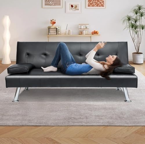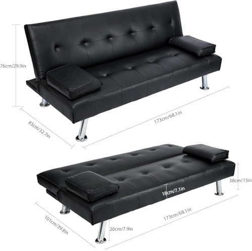 CROWNSHOP 3 Seater Sofas Modern Sofa Beds with Upholstered Convertible Sofas & Couches Couch Adjustable Angle Sofas with Metal Legs for Living Room/Spare Room/Guest Room Black PU Leather