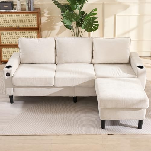 EINHOM L-Shaped Multifunctional Corner Sofa, Sectional Sofa with USB and Cup Holder, Fabric Sofa for Living Room Flat, with Reversible Recliner, Suitable For Many Styles (Beige)