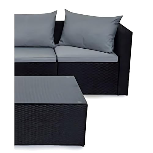 EVRE Miami Black Outdoor Rattan Garden Furniture Set for Patio Conservatories with 5 seat Modular Sofa Glass Top Coffee Table Foot Stool Cushions and Fade Resistance with Weatherproof Cover