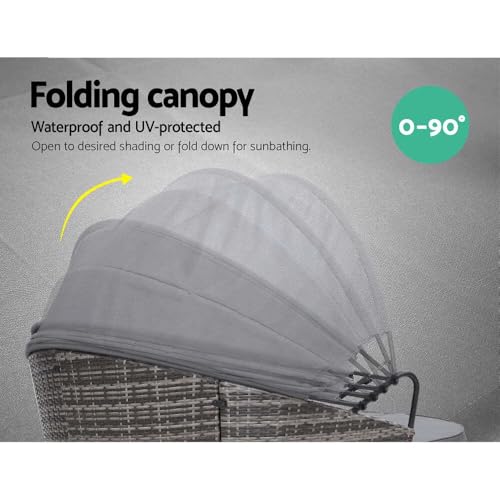 EVRE Seychelles Modular 5 Piece Outdoor Rattan Sectional Day Bed Chair Set with Retractable Canopy and Cushions Round Conversational Wicker Coffee Table (Grey)