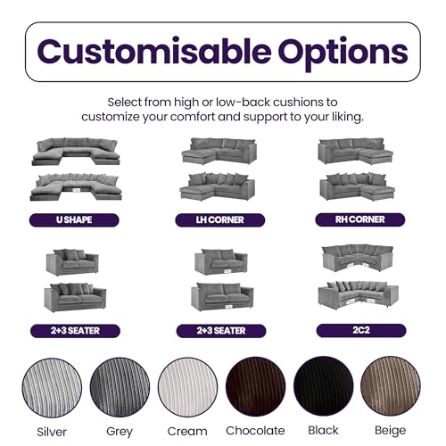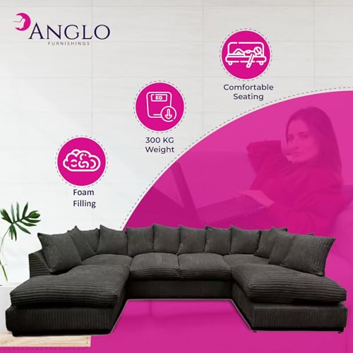 Generic U Shaped Cord Sofa – Back Cushion Sofa with Memory Foam Seating & Removable Covers – Versatile for Living Room, Bedroom, Office (Black, Scatter Back)