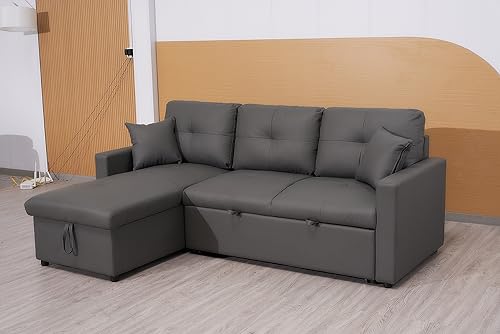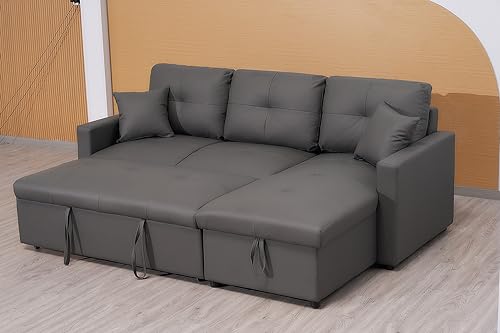 Grey 3 Seater Bonded Leather Corner Sofa Bed With Storage-Convertable Click Clack L Shape Pull Out Couch For Living Room (LEFT HAND SIDE)