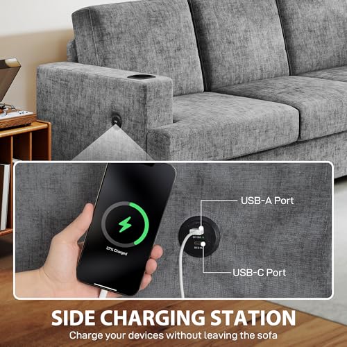 - USB ports and cupholders: This sofa keeps your devices powered up with both USB-A and USB-C ports, plus two cupholders right where you need them