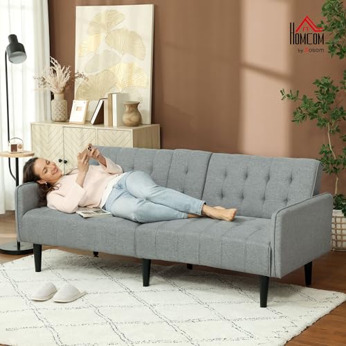 HOMCOM Click Clack Sofa Bed, Linen-Feel Fabric 3 Seater Sofa for Living Room/Spare Room/Guest Room, Bed Settee with Cup Holders, Light Grey