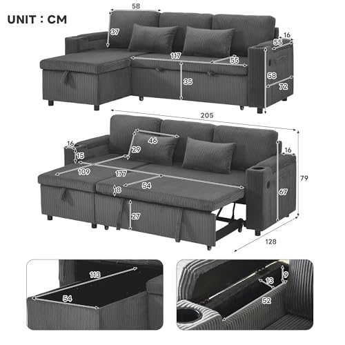 Miyemo 3 Seater Sofa Bed, 3 In 1 Convertible Sleeper Bed with Storage & Charging-Station, L Shaped Corner Sofa, Pullout Sectional Daybed with Cup Holders & Side Pockets, Corduroy, Grey