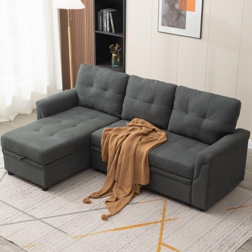 Panana 3 Seater Universal Sofabed, Pull Out Sleeper Corner Couch Bed with Storage Chaise. Black Faux Leather (Gray Linen Fabric #2)