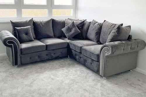 - ? LUXURIOUS DESIGN: Elegant Chesterfield-style corner sofa featuring plush velvet upholstery, deep button tufting, and decorative rolled arms with silver studding detail