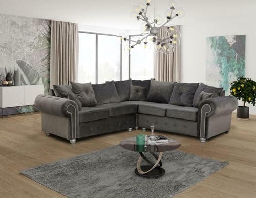 Plush Velvet Corner Sofa – L-Shaped Chesterfield Couch Settee – Tufted Grey with Silver Chrome Feet Sofa Set – Luxurious Grey Sectional 3 and 2 Seater for Living Room Lounge Indoors