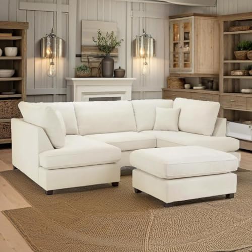 Sectional U Shaped – 6 Seater Corner Settee – Comfortable U Shape Full Back Couch – Modern Cinema Fabric Sofa with Footstool – Sofas Bed for Living Room & Lounge (Cream)