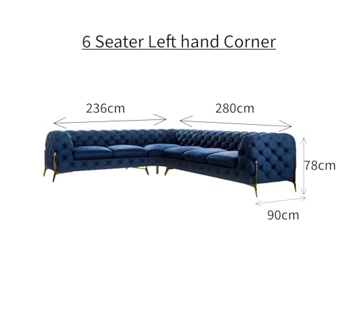 Snooze Chesterfield Corner Sofa – 4 to 6 Seater L-Shaped Tufted Plush Velvet Chaise Lounge, Left/Right Hand Facing with Deep Button and Sturdy Legs (Blue Plush, 6 Seater Left Hand Corner)