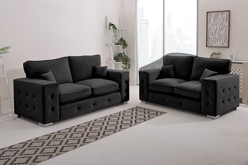 Sofahub Howard Black Plush Velvet Sofa –2 Seater, 3 Seater, 3+2 Seater & Corner Sofa – Fullback with Foam Cushions, Button Tufted Detailing, Chrome Feet –Modern Living Room Couch (Black, 3 + 2 Seater)