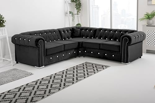 Sofahub Olympia Black Plush Velvet Chesterfield Sofa – Diamond Detailing & Foam Seat Cushions – Available in 2 Seater, 3 Seater, 3+2, Corner & Corner with Diamonds (Black, Corner With Diamonds)
