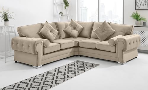 Sofahub Verona Cream Plush Velvet Sofa – 2 Seater, 3 Seater, 3+2 Seater or Corner Suite – Fullback Design, Button Tufted, Foam Cushions, Chrome Feet – Luxury Living Room Sofa Set (Cream, Corner)