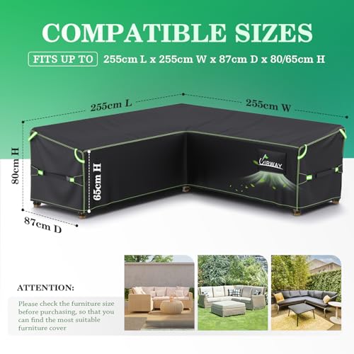 UIRWAY V-Shape Garden Furniture Cover Waterproof with Air Vent, 255x255x87cm Heavy Duty 420D Oxford Fabric Outdoor Rattan Corner Sofa Cover with Waterproof Tape, Reflective Strips