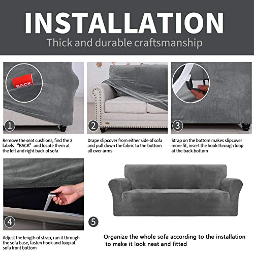 XINEAGE 1 Piece Velvet Couch Covers for 3 Cushion Couch Living Room High Stretch Sofa Cover Pets Dogs Friendly Anti Slip Thickened Slipcovers Furniture Protector (3 Seater, Grey)