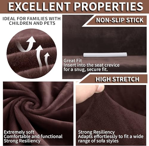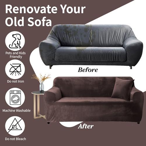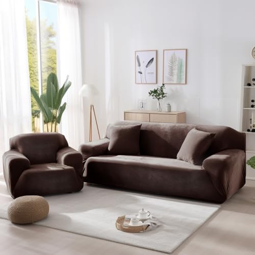 Yeahmart Thick Sofa Covers 1/2/3 Seater Pure Color Sofa Protector Velvet Easy Fit Elastic Fabric Stretch Couch Slipcover (Brown, 2 Seater 145-185cm)