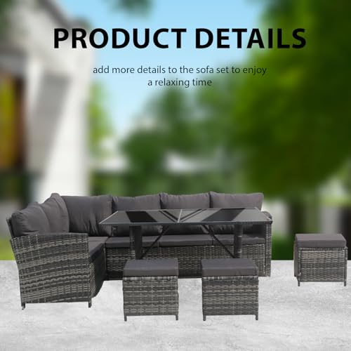 - 9 Seater Patio Set: The 9 Seater Patio Set made of premium material with a universal design, comes with 1x 3-seater corner sofa, 1x 3-seater sofa,1x table,3 x stool,1x Tempered glass,6x Seat cushions,7x Back cushions,3x Stool cushions, suit all type of outdoor environments. Create a natural and stylish spot in your garden or patio to enjoy and relax on sunny days